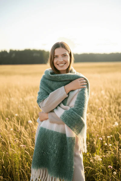 Découvrez l'écharpe style pashmina à larges rayures dans un coloris au choix vert ou rose. Son design enveloppant et sa texture moelleuse en font un incontournable de l'hiver.